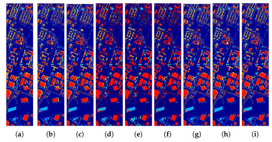 The input was specified using a 13 × 13 patch size, and 64 is selected as the batch size. For both the discriminator and generator, Adaptive Moment Estimation (Adam) [55] was the optimization method. The default value for the weight decay for -norm regularization was for all modules. The epoch with the highest OA on the validation set was utilized for early stopping after the loss function curve became stable (200 training epochs for the Houston dataset, 50 training epochs for the Pavia/HyRANK dataset, and 10 training epochs for the S-H dataset). A 12GB Nvidia GTX 3060 GPU (Manufacturer: Colorful, Shanghai, China) and Pytorch V2.0.0 were the fundamental hardware and software platforms.