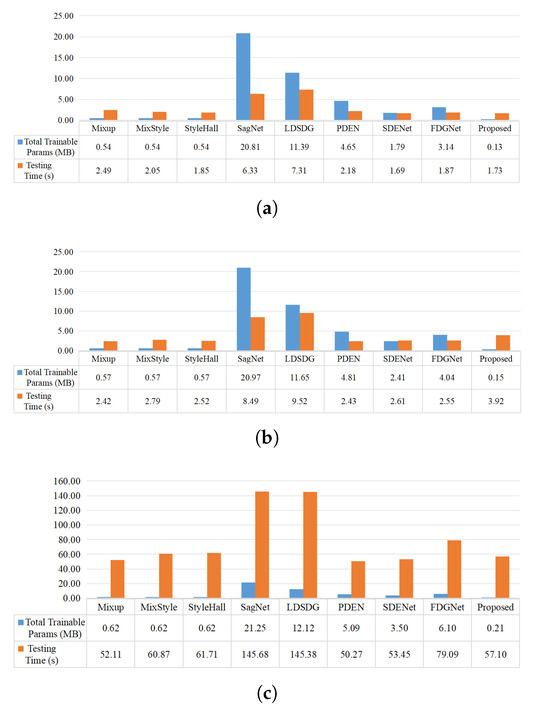 Comparison of total trainable parameter size and testing time. (a) SD = Houston13. (b) SD = PaviaU. (c) SD = HangZhou.