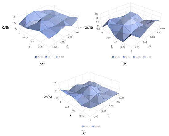 The centralization of spatial weight was affected by , as shown in Figure 15. A higher signifies less centralization and closer proximity to an all-one matrix. Similarly to , an extremely high or low value will lead to bias in OA. For , the primarily represents the spectral properties of the central pixel. Conversely, for , the becomes almost indistinguishable from the and results in invalid expansion.