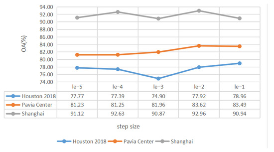 Random flips and random radiation noise (illumination) in the Houston dataset were used to strengthen the SDs four times, whereas the others remained untreated. A total of 80% of the labeled data from SD = Houston13/PaviaU was allocated for training, while the remaining 20% was reserved for validation. Meanwhile, 5% of the Hangzhou data were used for training, and the remaining data were used for validation. All samples in the TD were used for testing. The base learning rate, regularization parameters , and coefficient and were selected from the sets: , , , and . Cross-validation was used to determine the best parameters. For the three datasets, the selected base learning rate was . The parameters // were set to 1/0.5/7 for all datasets.