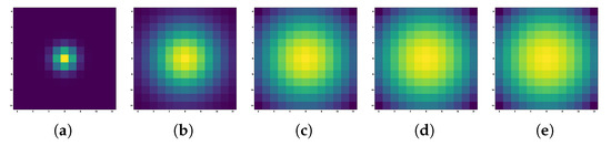 In order to alleviate the above problems, this study considers adding a special type of sample data to the training domain to deliberately distinguish the central pixel from other pixels in Figure 3. A discrete Gaussian operator is adopted using Equation (6), where and , and and represent the coordinates of the central pixel and the neighborhood pixel of the image patch, respectively.
