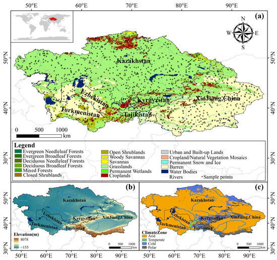 Location of the study area, the spatial distribution of (a) land types (based on the 2020 International Geosphere-Biosphere Programme Global Vegetation Classification, extracted from the MCD12Q1 dataset), and the distribution of random sampling points for the quantitative analysis, (b) DEM, and (c) Köppen–Geiger climate zones.