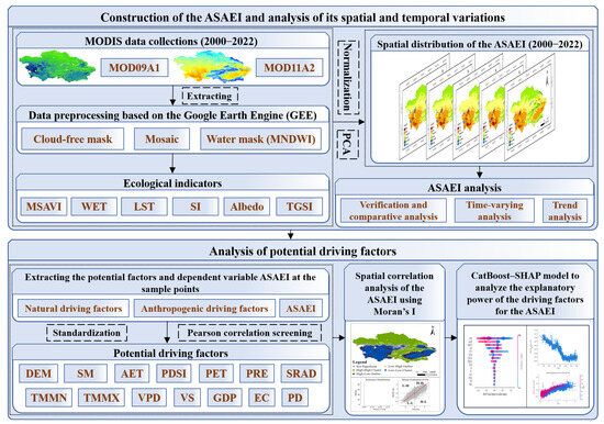 This study is comprised of four main steps: (1) constructing the ASAEI for the study area from 2000 to 2022 using Google Earth Engine (GEE) (https://code.earthengine.google.com/); (2) analyzing spatiotemporal changes based on the multi-year ASAEI dataset; (3) analyzing the spatial autocorrelation of ASAEI using Moran’s I to identify its spatial clustering pattern; and (4) applying CatBoost–SHAP to determine the response patterns of EEQ to various driving factors and assess their impact intensity. The detailed workflow is presented in Figure 2.