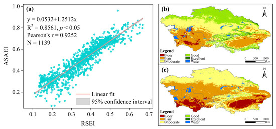 A comparison of the ASAEI and RSEI models for evaluating EEQ in CA: (a) a scatter plot showing the correlation between the RSEI and ASAEI values, and maps illustrating the distribution of the mean ASAEI (b) and mean RSEI (c) in CA.