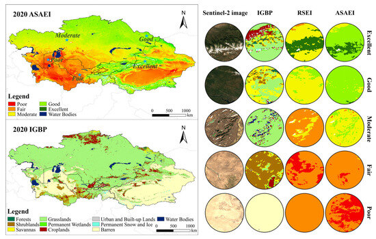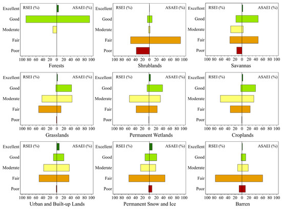 To further validate the advantages of the ASAEI in ASARs, five locations representing different EEQ levels were selected in 2020 for verification (Figure 4). High-resolution (10 m) true-color imagery from Sentinel-2 was compared with the IGBP, RSEI, and ASAEI classification results. Compared to the RSEI, the ASAEI more accurately reflects the actual environmental conditions in ASAR landscapes. Across all verification sites, the ASAEI demonstrated greater precision and reliability in identifying texture patterns and EEQ levels, showing superior consistency and spatial continuity. In regions classified as “excellent”, Sentinel-2 imagery captured geomorphological features associated with high vegetation coverage. According to the IGBP classification, land cover in these areas mainly includes forests, savannas, grasslands (the dominant type), and croplands. However, the RSEI results in these regions presented unrealistic discontinuities in ecological grading, with classifications ranging from “excellent” to “moderate” and even “fair”, which deviate notably from the actual vegetation and land cover. Such abrupt classification changes clearly diverge from the region’s actual distribution of vegetation cover and land types. In contrast, the ASAEI accurately captured the ecological characteristics of high vegetation coverage zones, offering improved consistency and spatial continuity in classification. In areas rated as “poor”, the texture features revealed by the ASAEI closely matched the geomorphological patterns visible in the imagery, effectively reflecting the ecological degradation present. Moreover, comparisons of the RSEI and ASAEI results under different IGBP land cover types in 2020 (Figure 5) indicated that the RSEI consistently underestimated the EEQ across various land categories.