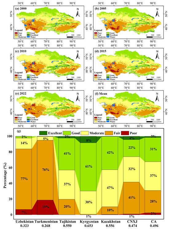 (a–f) The spatial and temporal distribution of different levels of the ASAEI in CA in 2000, 2005, 2010, 2015, and 2022 and the average during 2000–2022; (g) percentage of the ASAEI area in different subregions.