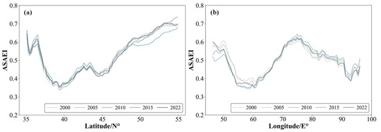 ASAEI statistics in CA (2000, 2005, 2010, 2015, and 2022). (a) Statistics of the longitude zone and (b) statistics of the latitude zone.