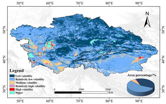 To further investigate the volatility within specific regions of CA, we analyzed the in the study area from 2000 to 2022 (Figure 8). Table 5 shows the percentage of areas with varying volatility levels. The volatility of the ASAEI in CA is generally low, and a comparison with Figure 6 reveals a strong correlation between ASAEI volatility and its magnitude. Regions with lower ASAEI values typically exhibit higher interannual variability. Areas with moderate to high volatility are primarily located in the southwestern and eastern regions, comprising 10.25% of the total area. In contrast, areas with low to relatively low volatility are mainly concentrated in the northern, northwestern, central, and northeastern regions, covering 89.75% of the total area.