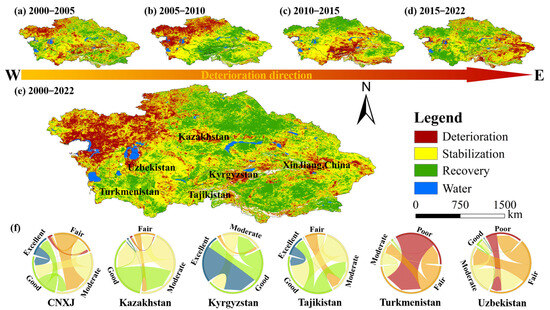 To capture the spatiotemporal variation of ASAEI in CA, we analyzed its changes from 2000 to 2022, along with the transitions in EEQ levels across the six subregions (Figure 9). Changes were classified using the Jenks natural breaks method into three categories: deterioration, stabilization, and recovery. Regions experiencing ecological degradation shifted from west to east over time. From 2000 to 2005, ecological degradation primarily occurred in Kazakhstan and Uzbekistan, intensifying between 2005 to 2010. From 2010 to 2015, ecological degradation was predominantly observed in Kyrgyzstan and Tajikistan. From 2015 to 2022, regions experiencing ecological degradation shifted to CNXJ. Overall, from 2000 to 2022, ecological restoration in the CA region surpassed degradation, although significant differences existed across geographical subregions: the western part of Kazakhstan primarily experienced degradation, while the eastern part saw restoration. EEQ-level transitions predominantly occurred within the good, moderate, and fair categories. In the other geographical subregions, restoration was the dominant trend. In Turkmenistan, EEQ shifted primarily from poor to fair, while in Kyrgyzstan, it fluctuated predominantly between excellent, good, and moderate levels.