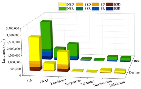 To further illustrate the ASAEI trend in the CA region, we present the distribution of ASAEI changes across each geographical subregion from 2000 to 2022 (Figure 11). Overall, ASAEI changes in the CA region exhibited an upward trend, with areas showing this trend constituting 54.64% of the total area. Notably, Kazakhstan was the only region exhibiting a downward trend, with the upward trend constituting only 46.55% of its total area. The remaining five geographical subregions, ranked by the proportion of area exhibiting an upward trend, were Tajikistan (79.93%), Kyrgyzstan (66.20%), Turkmenistan (64.34%), Uzbekistan (61.41%), and CNXJ (60.92%).