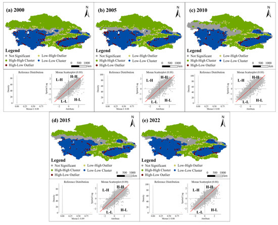 Spatial clustering distribution of the ASAEI and Moran’s I scatter plot (a–e): 2000, 2005, 2010, 2015, and 2022, with the red line indicating the fitted regression line representing the relationship between spatial lag and attribute values.
