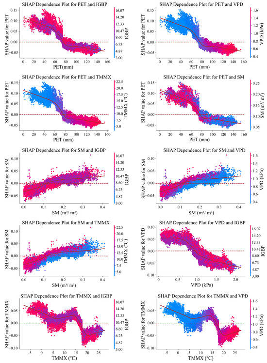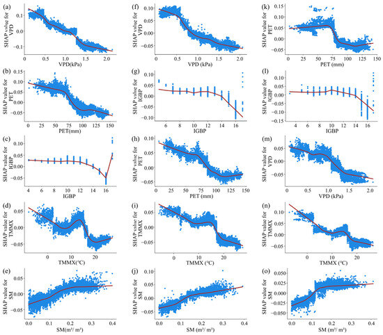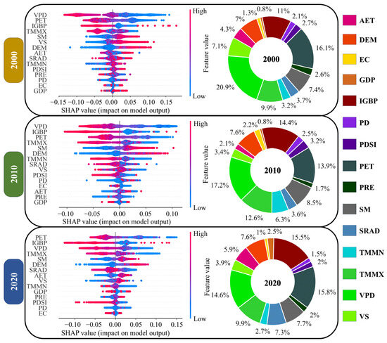 Table 6 presents the average results of the CatBoost–SHAP regression model, which was evaluated using 10-fold cross-validation across different years. The evaluation metrics—R2, MAE, and RMSE—consistently performed well across the years, with R2 exceeding 0.921 and the MAE and RMSE below 0.033 and 0.045, respectively. These results suggest that the CatBoost–SHAP regression model demonstrates strong explanatory power and can effectively reveal the relationship between ecological factors and the ASAEI.