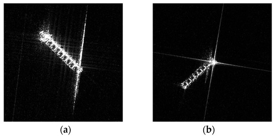 A sidelobe in SAR ship imagery typically manifests in two distinct patterns: cross-shaped and trailing-shaped. As shown in Figure 2a, trailing sidelobes are presented as streaks extending outward from the end of the target. Cross sidelobes, as illustrated in Figure 2b, are typically present as four orthogonal elongated stripes extending from the target.