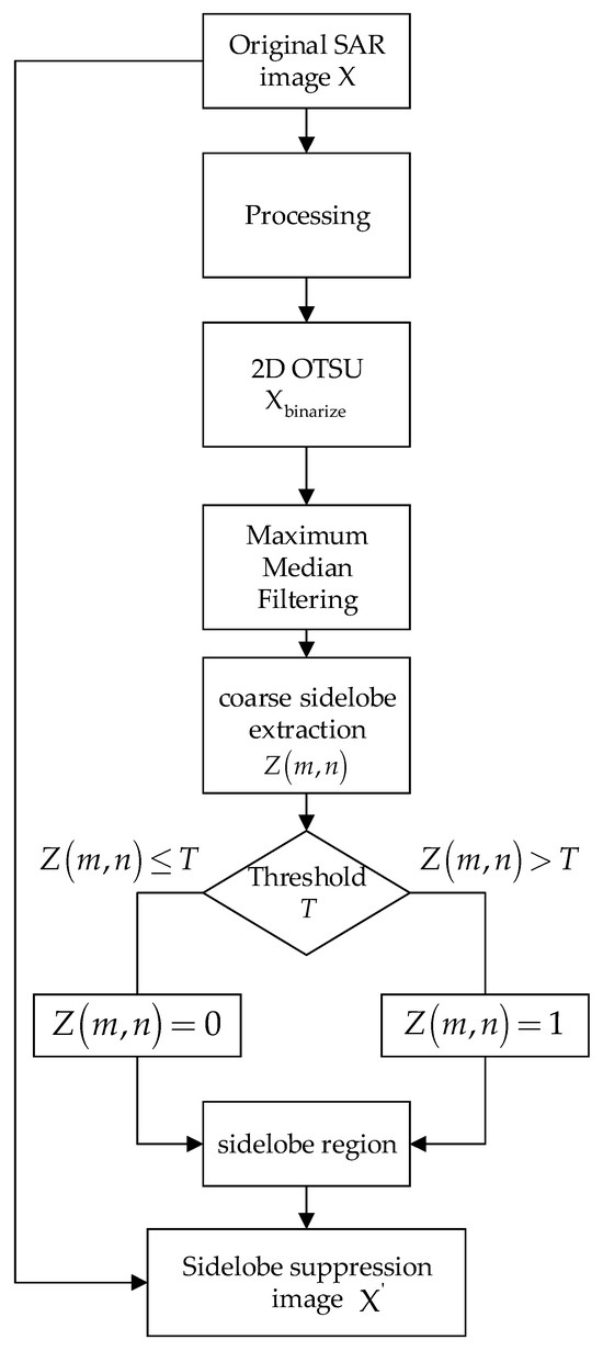 The main flow chart of the proposed sidelobe suppression algorithm is shown in Figure 3. First, SAR image X is preprocessed using morphological filtering to prevent the loss of target edges and internal detail information during the filtering process. Second, the preprocessed image is converted into a binary map using the two-dimensional (2D) Otsu method, enhancing the separability of target regions from the background and facilitating precise segmentation. Subsequently, we perform maximum median filtering on the obtained binarized image . The calculation is described as follows:
