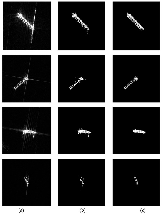 In the experiments, four representative ship slices were selected from the FUSAR-Ship dataset [27]. Figure 8 presents the processing results of four slices using the conventional Radon transform algorithm [22] and the proposed methodology. The sliding window size in maximum median filtering was adaptively configured according to target dimensions, with larger vessels necessitating larger window sizes. Based on a statistical analysis of ship sizes within the FUSAR-Ship dataset, the half-side length of the window was empirically set to N = 17 pixels. The threshold T was determined as half of the image’s maximum grayscale value.