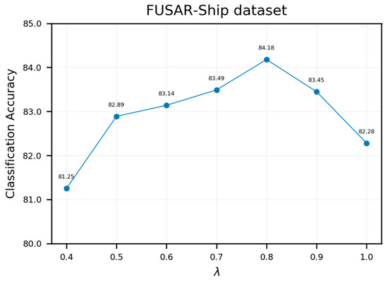 To justify the choice of λ, a sensitivity analysis was conducted under the same alternative parameter configuration. Figure 9 presents the hyperparameter selection results for the proposed framework. Increasing λ signifies that classification loss possesses greater importance within the hybrid metric loss function. It is evident that the optimal value of λ is 0.8, achieving an accuracy of 84.18%. When λ > 0.8, the contribution of Circle loss to the hybrid metric loss function diminishes, impeding the model’s ability to fully capture inter-sample relationships and thus preventing optimal performance. When λ < 0.8, the classification performance deteriorates progressively with decreasing λ values. Notably, when λ falls below 0.5, the classification accuracy declines significantly to 81.25%. This result is consistent with the theoretical analysis. Classification loss emphasizes the supervision of class-discriminative information to capture differences between categories, whereas pairwise loss focuses on local information between samples and uses inter-sample differences to fine-tune the decision boundary of the model. An excessively low λ value leads to interference with the direction of model optimization and overfitting. Thus, we recommend maintaining a sufficiently high α value to ensure stable model convergence.