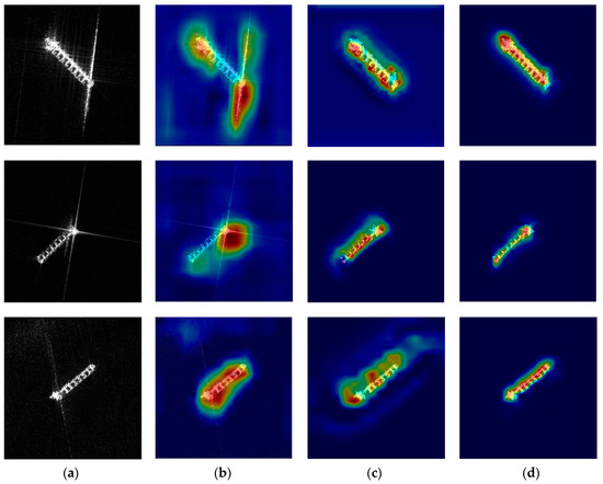 Original ship images and attention maps: (a) original SAR image; (b) visualization results without sidelobe removal; (c) visualization results of DML without the feature extraction module; (d) visualization results of DML with sidelobe removal and the feature extraction module.