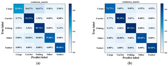 By examining the confusion matrix in Figure 11a, it can be observed that two classes, namely, ‘Carrier’ and ‘Fishing’, achieve excellent classification accuracies of 92.31% and 89.74%, respectively. On the other hand, the ‘Cargo’ type of ships exhibits the lowest classification accuracy, with a rate of only 55.56%. This phenomenon is mainly attributed to the imbalance of samples and the obstruction caused by the sidelobes, which has a greater effect on smaller targets’ geometric feature extraction, resulting in poor classification performance for the ‘Cargo’ type.