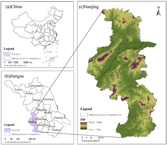 Study area of Nanjing, China: (a) China; (b) Jiangsu province; (c) topography of Jiangsu Province.