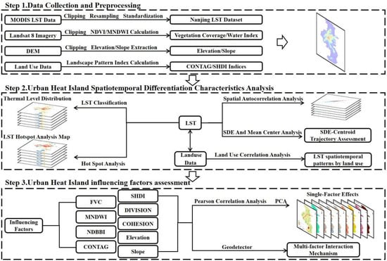 This study is divided into three core phases (Figure 2). First, we conducted spatial clipping and projection transformation on the annual 1 km land surface temperature (LST) dataset of Jiangsu Province from 2000 to 2020, provided by the Data Center for Resources and Environmental Sciences, Chinese Academy of Sciences. This process yielded a 1 km resolution LST dataset for Nanjing from 2000 to 2020. Additionally, based on Landsat 8 imagery, we extracted vegetation cover and the modified normalized difference water index (MNDWI) to reflect the spatial distribution of vegetation and water bodies on the ground. Second, this study employed the standard deviation method and spatial autocorrelation analysis to investigate the spatiotemporal variations in the urban heat island effect, identifying trends in high-temperature area expansion and aggregation patterns, along with temperature differences across various land use types. Finally, integrating both natural and human factors, Pearson correlation analysis and geographic detectors were utilized to assess the influence of multidimensional factors on surface temperature and their synergistic effects, clarifying the cooling mechanisms involving vegetation coverage, topography, and landscape patterns.