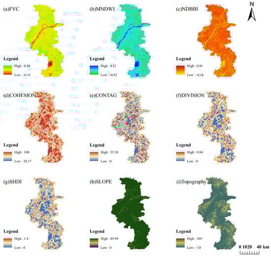 Surface information of Nanjing: (a) FVC; (b) MNDWI; (c) CONTAG; (d) SIIDI; (e) DIVISION; (f) COHESION; (g) NDBBI; (h) DEM; (i) SLOPE.