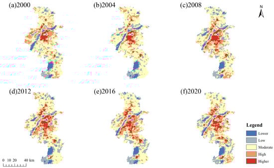 Thermal grade distribution map from 2000 to 2020: (a) 2000; (b) 2004; (c) 2008; (d) 2012; (e) 2016; (f) 2020.