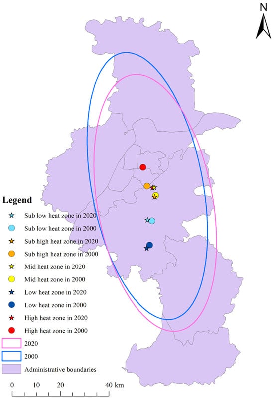 (1) From 2000 to 2020, the urban heat island effect in Nanjing has exhibited a trend of radiating outward from the center. The heat island areas are primarily concentrated in established zones, such as densely populated old towns and commercial centers, with a spatial distribution pattern of surface temperature that gradually decreases from the city center to the suburbs. Multiple high-temperature centers have emerged, including the Xinjiekou business district, the Qinhuai River scenic area, and the Gulou commercial area. The standard deviation ellipses and the centroid of high-temperature areas also demonstrate a southward shift.