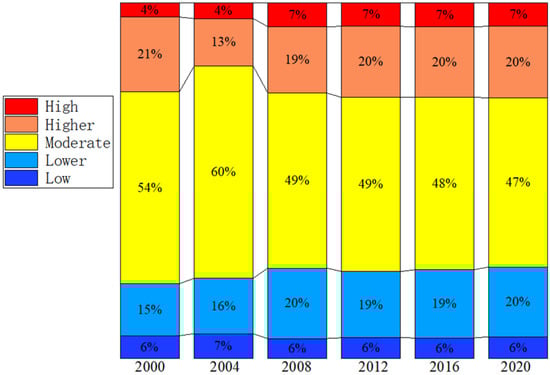 During this period, the area of low-temperature zones remained relatively constant at about 6% of the total area, while the area of secondary low-temperature zones increased by 5.03% over 20 years (Figure 6). The area of medium-temperature zones rose by 5.66% from 2000 to 2004 but then continuously decreased, resulting in a total reduction of 12.20% by 2020. The area of secondary high-temperature zones decreased by 7.65% from 2000 to 2004, but steadily increased afterward, reaching levels nearly equal to those in 2000 by 2020. The area of high-temperature zones has increased annually since 2000 and then stabilized.