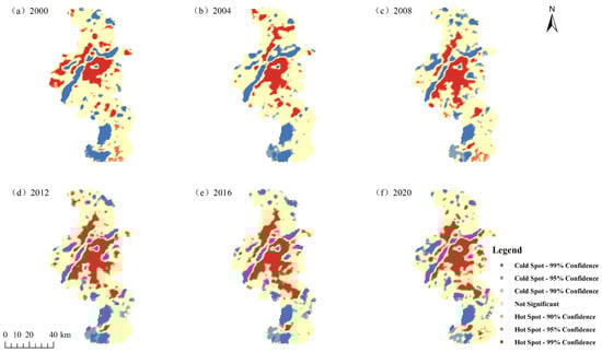 Analysis of the spatial changes in hotspots from 2000 to 2016 shows a continuous expansion of thermal aggregation areas, especially in the main urban areas. However, by 2020, there was a trend of contraction in these thermal aggregation areas. This change may be linked to the slowdown in the growth rate of built-up areas in Nanjing after 2016, along with a continuous increase in green coverage and green space. Enhancing vegetation coverage can help mitigate the urban heat island effect. Overall, thermal aggregation areas in Nanjing show a trend of shrinking and fragmenting, while cold aggregation areas exhibit fluctuations followed by stabilization.