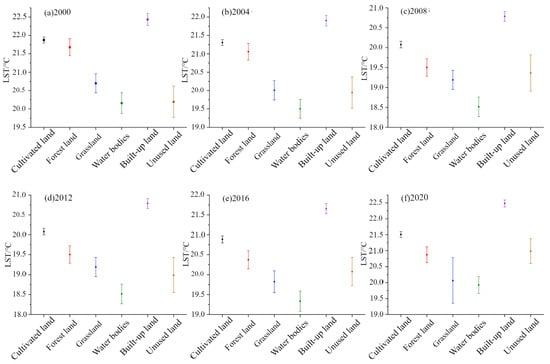 The urban heat island effect is closely related to land cover types, making its study significant for understanding this phenomenon. In this study, overlay the average surface temperatures of Jiangsu Province for the years 2000, 2004, 2008, 2012, 2016, and 2020 with land use data to obtain statistical results regarding surface temperatures among different land use types. The findings indicate significant differences between various land use categories (Figure 8). During the study period, the average surface temperature for all land use types in Jiangsu Province exhibited fluctuations, which are closely related to annual temperature variations. Notably, the average temperature of built-up areas is significantly higher than that of other land use types. Furthermore, the standard deviation of land surface temperature (LST) for grasslands and unused lands varies annually, indicating that the surface temperatures of these two land use types undergo significant and irregular changes within the study area. This variation is primarily attributed to the relatively small area of grasslands and unused lands in the study region, leading to pronounced differences in surface temperature. In contrast, built-up areas and croplands demonstrate smaller standard deviations in surface temperature, reflecting a stable high-temperature environment, while water bodies and forests maintain a relatively stable low-temperature environment.