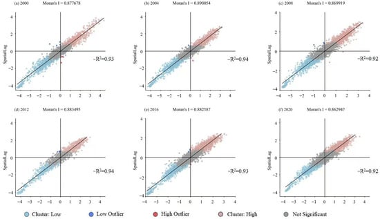 A spatial autocorrelation analysis was conducted on the land surface temperature (LST) of Nanjing from 2000 to 2020. As illustrated in Figure 9, the global Moran’s I index for LST across six time periods all exceeded 0.8, indicating a highly significant global spatial autocorrelation. The LST exhibited a strong positive spatial correlation. From the perspective of local spatial autocorrelation, the number of points in the first and third quadrants were significantly higher than that in the second and fourth quadrants. This suggests that regions with “low–low” and “high–high” LST clusters are more numerous than those with “high–low” and “low–high” clusters. In other words, areas with low (or high) LST in Nanjing are more likely to be spatially aggregated. The geographical location of Nanjing determines its climatic characteristics. The city has a subtropical monsoon climate, with warm springs, cool autumns, hot summers, and cold winters. The four seasons are distinct. The presence of the Yangtze River and numerous lakes and water bodies endows the region with a pronounced humid climate. The southern and eastern parts of the city are characterized by hilly terrain, which makes it difficult for southeast winds to penetrate. Consequently, the heat from ground radiation is not easily dissipated. These factors contribute to the urban heat island effect, making the urban area more susceptible to high temperatures. However, due to the abundance of water bodies and hills, and the relatively low population density, cold islands tend to form around the lakes.