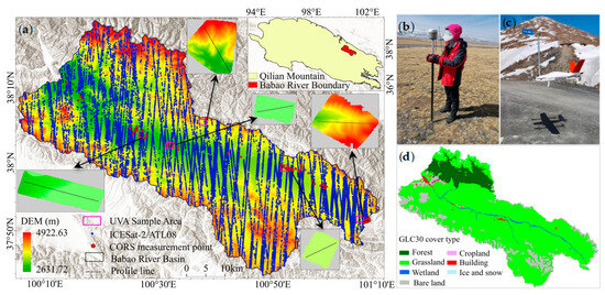 Overview of the study area: (a) Babao River Basin and five UAV sample areas; (b) GPS CORS measurements; (c) UAV data collection; (d) GlobeLand30 Land Cover Types.