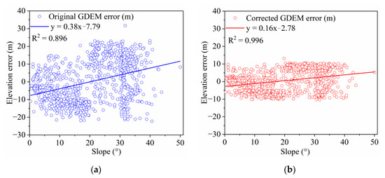 Comparison of GDEM errors based on randomly selected true elevations: (a) The Relationship between error and slope of original GDEM; (b) The relationship between error and slope of GDEM after correction.