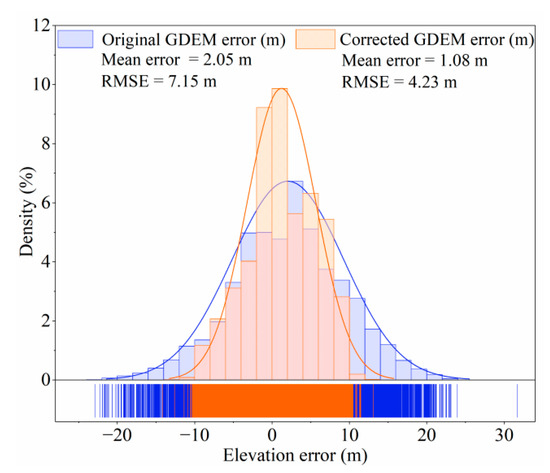 Overall error distribution between original GDEM and GDEM after correction and actual elevation.