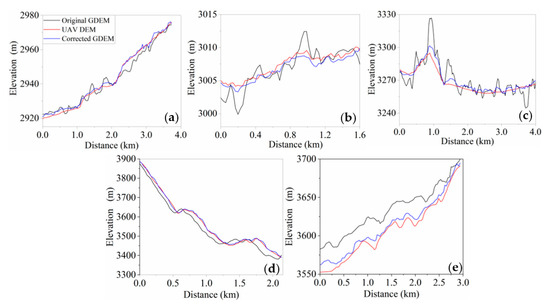 Comparison of elevation cross-sections of UAV DEM, corrected DEM, and original GDEM: (a) Arou area; (b) Baishiya area; (c) Ebao area; (d) Mangzhayakou area; (e) Jingyangling area.