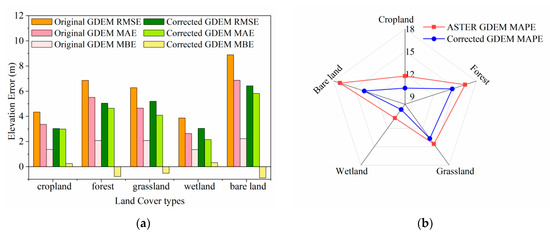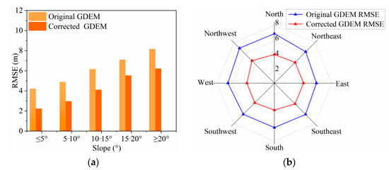 Results showed that there is a significant correlation between the slope and the vertical accuracy of the original GDEM. As the slope increases, RMSE, MAE, MBE, and MAPE also increase accordingly. When the slope is ≤5°, the accuracy of DEM is the highest (RMSE = 4.21 m), and when the slope is ≥20°, the accuracy of DEM is the lowest (RMSE = 8.16 m). After DEM correction, the RMSE of GDEM has decreased and the accuracy has been improved at different slopes, as shown in Figure 8a. Especially in areas with a slope of ≥5°, the GDEM correction effect is particularly significant, reducing RMSE by 1.97 m and improving accuracy by 46.7%.