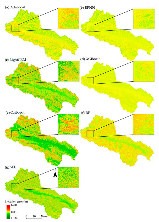 To further evaluate the superiority of the SEL model, 740 CORS data and 48,000 ATL08 points were selected to evaluate the accuracy of GDEM after the correction of seven models, and RMSE, MAE, and MAPE were taken as accuracy evaluation indexes to compare the performance of the seven models, as shown in Table 7. It can be seen from the results that the GDEM error after SEL model correction is the smallest, with RMSE of 4.08 m, MAE of 3.62 m, and MAPE of 11.58%. Followed by LightGBM with an RMSE of 5.89 m and MAE of 4.57 m, and BPNN with an RMSE of 6.01 m and MAE of 4.71 m, respectively. In addition, CatBoost performed the worst with 5.90 m RMSE and 4.58 m MAE; the RMSE of XGBoost is 5.99 m, and the RMSE of AdaBoost is 5.92 m. The RF model has the worst error; RMSE, MAE, and MAPE were 6.75 m, 5.06 m, and 14.26%, respectively. The above showed that the SEL model has the best accuracy in GDEM correction, followed by LightGBM, CatBoost, AdaBoost, XGBoost, and BPNN, while RF has the worst GDEM correction effect.