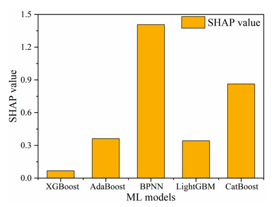 In addition, to evaluate the contribution of independent variables to ML models, the mean SHAP (Shapley Additive exPlans) value was used [56]. The greater the importance of parameters in the model, the higher their values; on the contrary, the smaller its contribution to the model, the smaller its value.