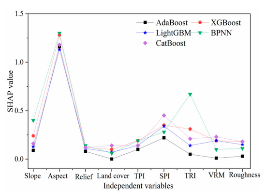 At the same time, to further discuss the importance of the nine independent variables to the five ML models, the model contribution of nine independent variables was systematically analyzed based on 100,000 ATL08 data points and the SHAP mean method (Figure 12). The results showed that aspect has the strongest feature importance in all ML models, and its SHAP average is always higher than 1.0, indicating that this variable contributes most significantly to model correction error. Secondly, the SHAP mean value of SPI is large, and the influence of other independent variables is relatively weak. In BPNN, except for aspect outward, the average SHAP values of slope and TRI are relatively large, indicating their importance to BPNN. Among the five ML models, the SHAP values of land cover types and roughness are the smallest, indicating that the contribution of correction error is relatively low.