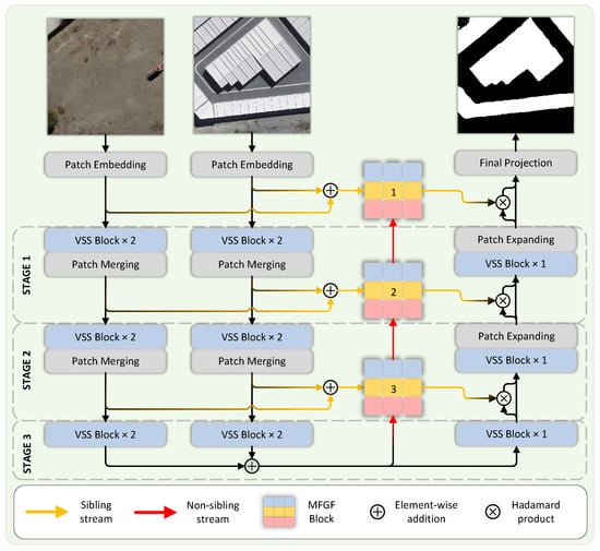 Firstly, the inputs X and Y are processed by the Patch Embedding layer. This layer employs a convolution with a stride of 4 to segment the input images into multiple non-overlapping patches. Such downsampling mitigates interfering and irrelevant information, thereby facilitating subsequent global modeling by VMamba and MFGF. Layer normalization follows, yielding embedded images , with C set to 96 by default. Afterwards, they are forwarded to the VMamba-based Siamese encoder (details in Section 3.2) with shared weights for feature extraction. Several studies [34,35] have indicated that the default scanning path of the CSM in VMamba is imperfect. Our strategy is to maintain the original structure of the VSS block and externally implement two enhancement methods. Specifically, the first method is to conduct downsampling via Patch Merging, where the global linear mapping can effectively model global relationships. The second is leveraging the self-attention block in MFGF (details in Section 3.3) to progressively guide the multi-scale features extracted by the encoder, which can effectively model the multi-scale global feature relationships and augment the expression of deep abstract features. Then, the features are fully fused through the decoder, and at the same time, the size of the feature map is gradually restored to the same size as the input tensor of the same-level encoder using linear mapping. Finally, the encoder output is passed through a final classification layer, restoring it to the original image dimensions. Subsequently, a convolution layer generates the final change detection result.