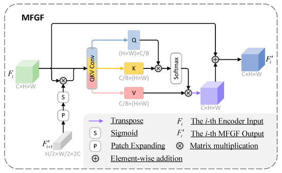 Subsequently, a residual connection is constructed between the input of the i-th level MFGF and the output of the deeper MFGF . Before the multiplication operation, Patch Expanding and a sigmoid activation function are implemented on . The Patch Expanding operation modifies the dimensions of to be congruent with those of , and the sigmoid function transforms the values into weights ranging from 0 to 1:
