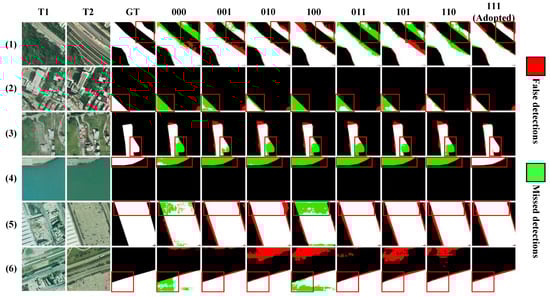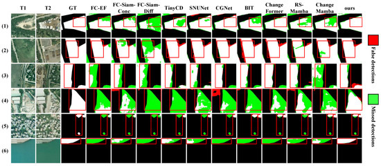 In the visualization results of the SYSU-CD dataset, extensive red regions (representing false detections) and green regions (denoting missed detections) are observed, with the green regions being more conspicuous, suggesting a more pronounced problem of missed detections. Through qualitative examination of the bi-temporal change images, it is apparent that in the majority of cases, the extent of change within the regions is not highly pronounced (Figure 5(4)–(6)), and the boundaries are hard to define (Figure 5(2)). These factors account for the challenging characteristics of the SYSU-CD dataset. The visualization results depicted in Figure 5(1)–(3) seem comparatively better on account of more prominent changes, larger areas of change, and a less complex background. Nevertheless, they still display diverse levels of missed and false detections. For example, in Figure 5(1), the red-boxed area exhibits analogous texture characteristics in the T1 and T2 images (sandy soil and cement surfaces, respectively), resulting in missed detections in numerous results. Overall, our proposed method generated the most favorable visualization results with the minimal amount of green (missed detections) regions, demonstrating its capacity to mitigate or resolve the problem of missed detections in change regions to a certain extent.