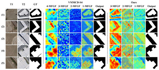 To further elucidate the feature space in the two distinct settings, we present the feature activation maps output by each stage of MFGF for both models, as illustrated in Figure 8. The four-stage model exhibited certain unfavorable characteristics during its operation. Firstly, the feature maps at the middle two scales of the model were in a state of weak activation. This implies that the features extracted by the middle two stages contributed relatively little to the overall classification process. Secondly, the abstract features extracted by the deepest stage of the model, namely, “4-MFGF”, were relatively inferior, and the features extracted by the shallowest stage, namely, “1-MFGF”, were not the edge features typically extracted by a general shallow network (despite the overall appearance being highly consistent with the ground truth) but rather certain texture features within the change area.