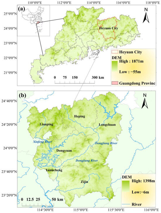 Study area: (a) Guangdong Province, China; (b) Heyuan City, Guangdong Province.