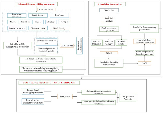 This study investigates the cascading hazard chain of landslide-induced dam formation and subsequent outburst flood, employing a multi-model coupling approach to unravel the propagation mechanisms across interconnected hazards. The methodology framework of this study is shown in Figure 4.