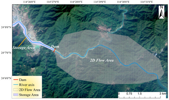 The storage area is established in the upstream region, while the 2D flow area is designated in the downstream region. This landslide dam serves to connect the storage area with the 2D flow area. The mesh in the 2D flow area was computed with a spatial resolution of 30 m × 30 m. External boundary conditions, referring to the most upstream and downstream ends of the river system need to be set in HEC-RAS 6.4.1. The time step for simulation used was set to 1 s. The upstream boundary is fixed at the reservoir extent (storage area), and the input flow data is derived from the design flood hydrograph determined through the integrated unit line method in Guangdong Province. The downstream boundary is set at the normal depth slope.