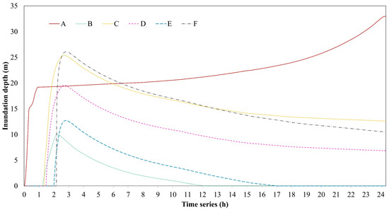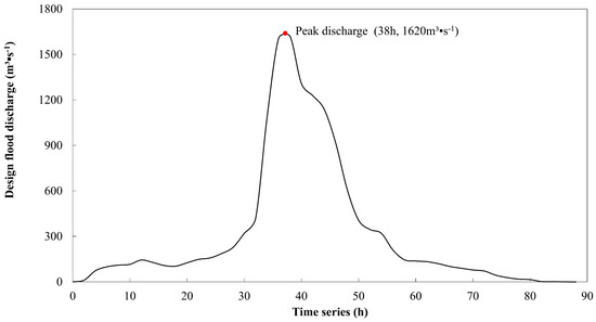 The design values of precipitation and river discharge in different recurrence periods are shown in Table 4. Notably, from 10 June to 12 June 2019, Heyuan City experienced sustained heavy rainfall. Over this 72 h period, multiple monitoring stations recorded rainfall intensities ranging from heavy to extreme levels, with cumulative precipitation exceeding 500 mm. This rainfall magnitude approached the 100-year return period design precipitation threshold for the region. Consequently, the design discharge value of 100-year return period was chosen for outburst flood simulation, and the design flood hydrograph is illustrated in Figure 6. This flooding process serves as the upstream boundary condition for the HEC-RAS 6.4.1 model.
