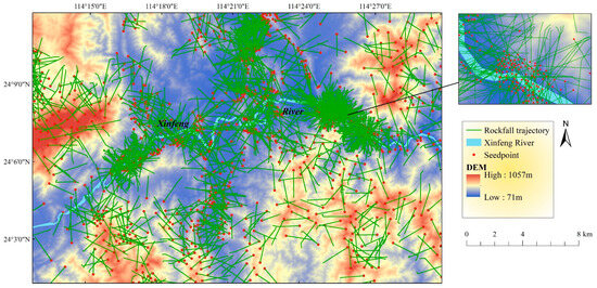 Based on the landslide susceptibility assessment, the area of extremely high susceptibility was selected for mass trajectory simulation. The Xinfengjiang River Basin exhibits steep terrain with an average elevation of approximately 700 m. Fluvial erosion has sculpted a distinct U-shaped valley, creating a stepped geomorphological profile that provides favorable geological conditions for landslide disaster chain development. Moreover, as the primary water source for the Pearl River Delta, twenty potential landslide points have been identified in the upper reaches of the Xinfengjiang Reservoir through visual interpretation. Landslide-induced disaster chains could threaten reservoir safety through cross-regional cascading effects. This underscores the strategic imperative to prioritize landslide dam analysis in the Xinfeng River Basin.