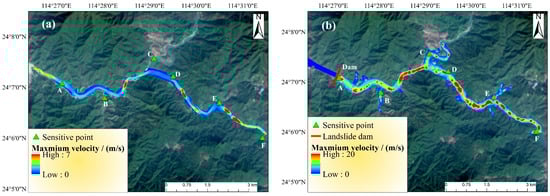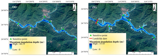 (3) The HEC-RAS 6.4.1 model is employed to simulate outburst flood evolution. The timing of dam failure is determined, and a novel emergency response parameter, outburst flood arrival time (FAT), is introduced to define the time threshold for initiating downstream evacuation. This provides a critical time window for timely implementation of actions for affected populations of downstream regions. In addition, outburst floods exhibit greater destructive potential and more intricate inundation characteristics than typical mountain flash floods. This underscores the need for flood control planning to incorporate separate analyses of landslide dam failure scenarios, thereby enhancing the effectiveness of mitigation measures and ensuring broader evacuation zones for improved safety assurance.