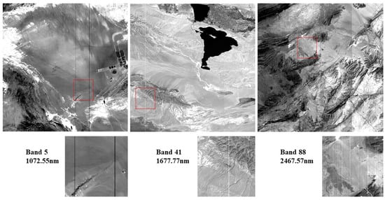 The bad lines and strips in ZY1-02D AHSI Level 1 HSIs (SWIR bands). The lower image shows a magnified view of the region outlined by the red square in the upper image.